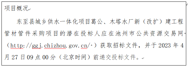 項目名稱:東至縣城鄉(xiāng)供水一體化項目葛公、木塔水廠新(改擴(kuò))建工程管材管件采購項目